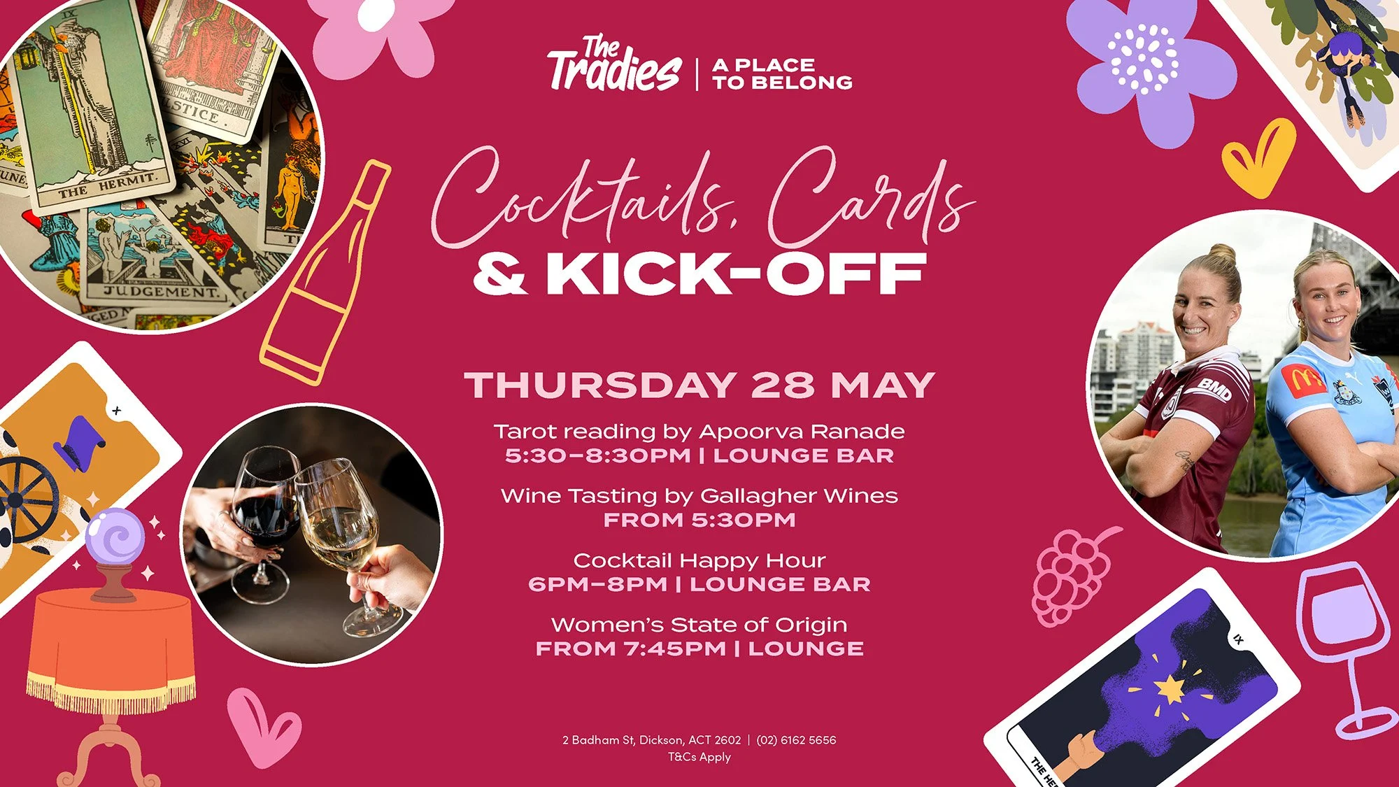 Throughout the afternoon, enjoy tarot readings with Apoorva Ranade and a touch of magic from roaming magician Conor Leisky. Then wind down the day with NRL Live & Loud in the Lounge.